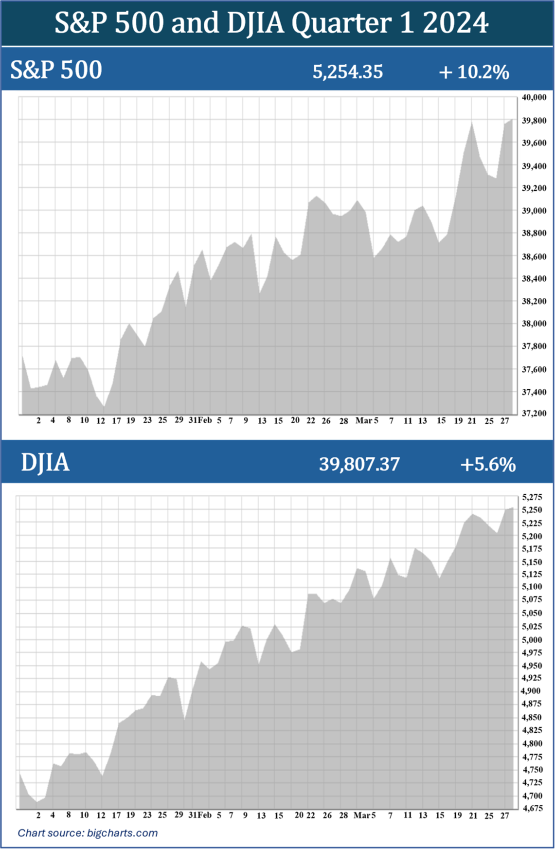 For the quarter, the S&P 500 advanced over 10% and closed the quarter at 5,254. The Dow Jones Industrial Average finished the quarter at 39,807, adding over 5%. (www.investopedia.com; 4/1/2024)