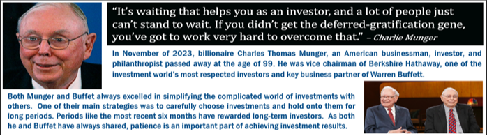 While economic and inflation trends typically affect equity markets more than election results, this year includes a presidential race that will keep everyone on their toes. There are also key races for the Senate and House of Representatives and election results could impact government policy and tax law, leaving much up in the air. We can be sure that the media will be hyper-focused on the upcoming election, however investors still need to remain focused on key factors such as economic growth, inflation movement, and interest rate changes when determining the best path for their investment decisions. As mentioned earlier, as of the quarter’s end, equity markets were still experiencing a rally, however investors need to be prepared in case there is a potentially overdue pullback. Once again, 2023 and the first quarter of 2024 rewarded long-term investors and we stand by our belief that investing should be measured based on long- term results.