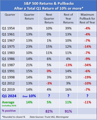 As our chart shows, since 1954, after a first quarter of more than 10% returns in the S&P 500, the second quarter was higher nine out of eleven times. All those years included pullbacks (a temporary retreat of no more than 5-10% in the price of a stock) during the year, however, ten out of those eleven years ended with positive returns, with an average of 11% (coincidentally the average pullback was also 11%). Please remember as with all data, past performance does not indicate or guarantee future results.